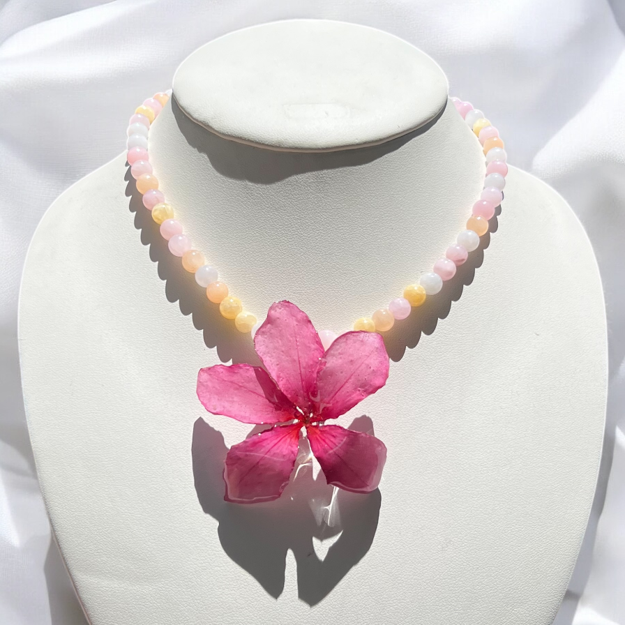 Florecita Plumeria encapsuladas con una cadena de piedras naturales de río, destaca con esta belleza natural en ti