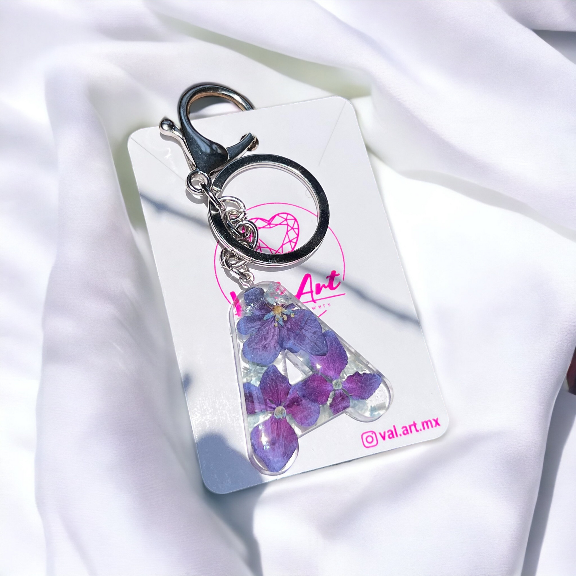 Llavero de letra de florecitas naturales de hortensia encapsuladas.